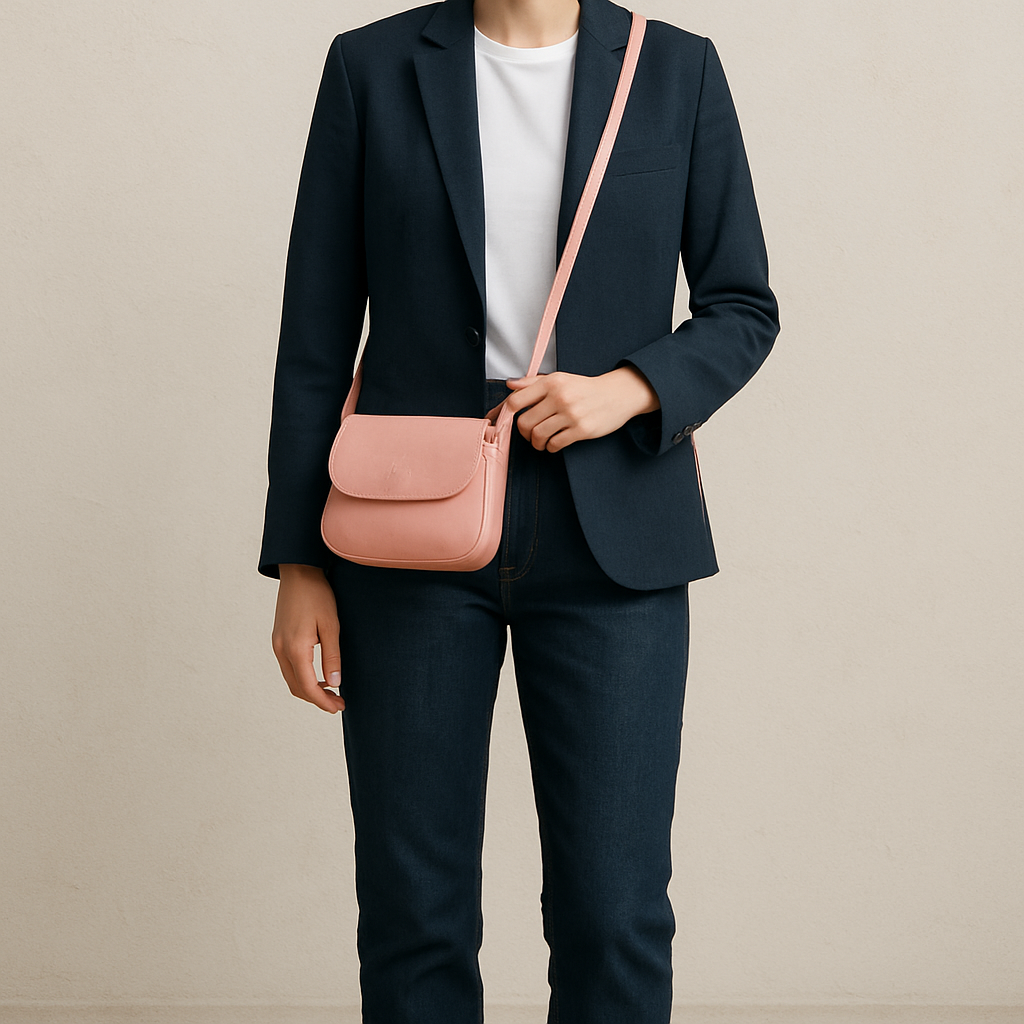 Putting it all together is simple with a go-to formula. Picture your structured blush pink bag paired with classic workwear staples: a crisp white blouse, tailored navy trousers, and a sharp grey blazer. Here, the soft pink acts as a “new neutral,” complementing the professional palette while breaking up the monotony. This look works every time, proving that the right pink bag is a versatile asset for far more than just your weekend plans.